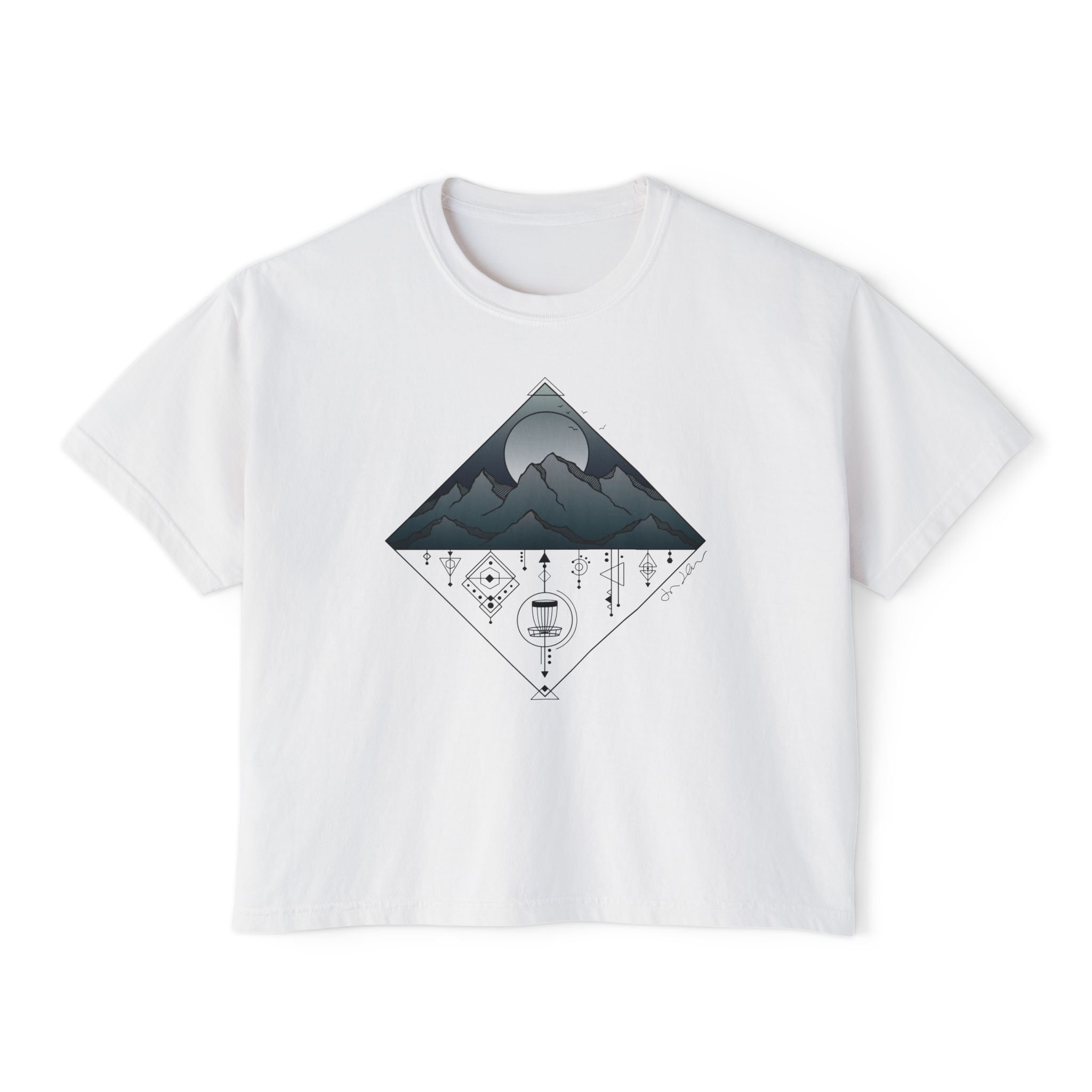 Soft, substantial cotton meets a quiet alpine horizon in this Women’s Disc Golf Boxy Tee—the very first release in the GoodBird.Store Artist Series. This debut design features the work of artist Jessica Jacklich, whose geometric mountain scene captures deep shadows, crisp peaks, and delicate line work in a way that feels both grounded and expansive. Created as a standout piece in our Ladies Disc Golf Apparel collection, this Women’s Disc Golf tee shirt blends art, adventure, and everyday comfort.